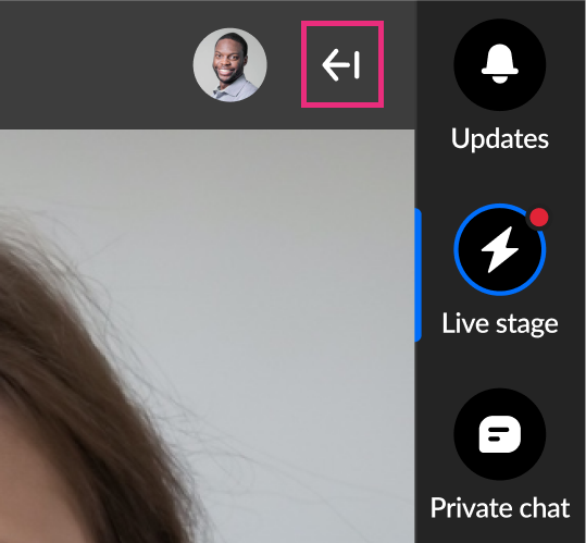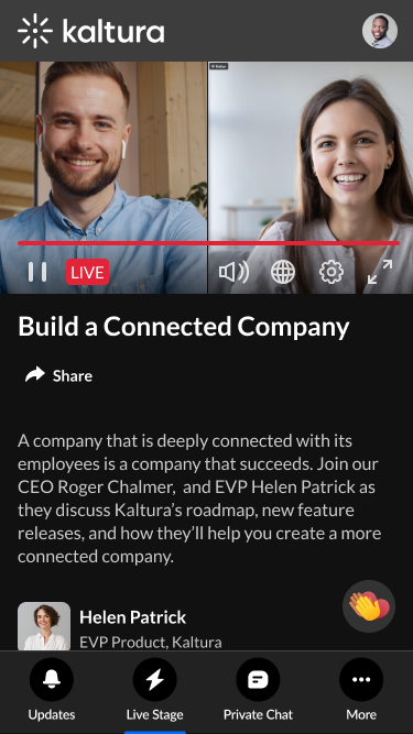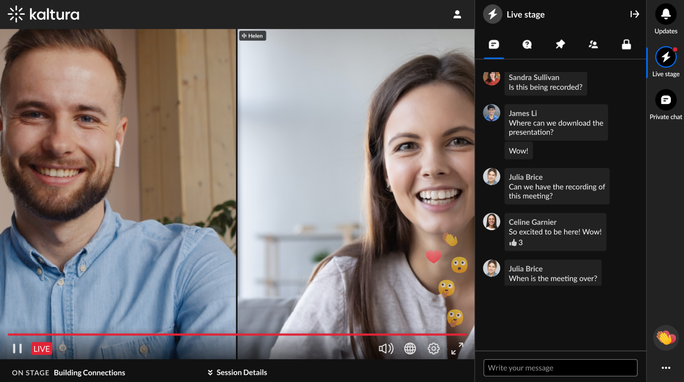 The chat and collaboration features in the Live Stage tab vary depending on whether your account administrator has enabled a Public Q&A experience.