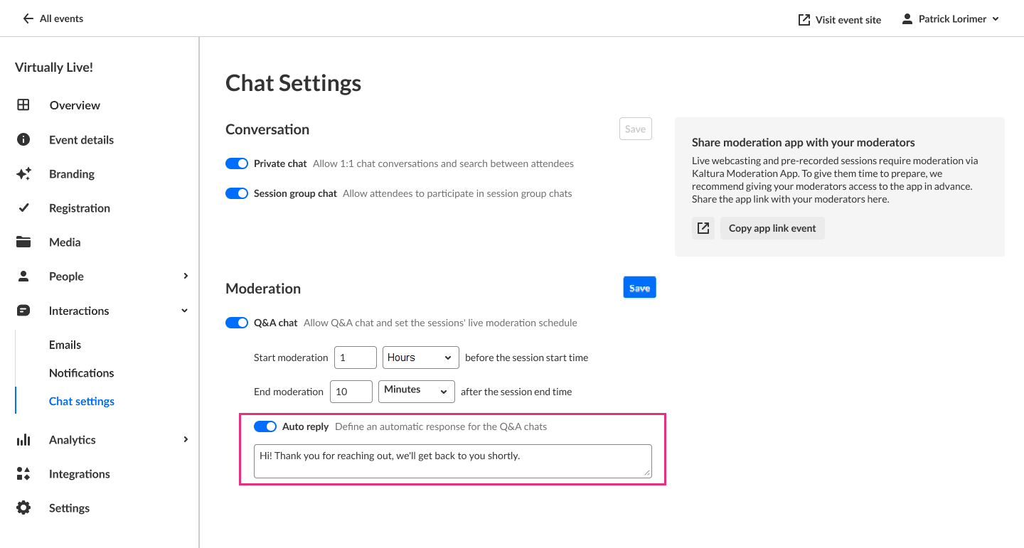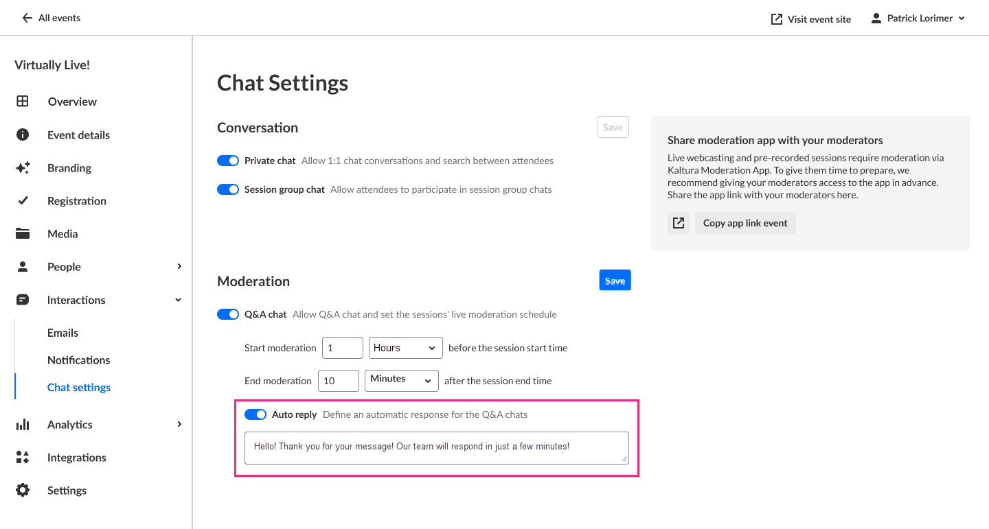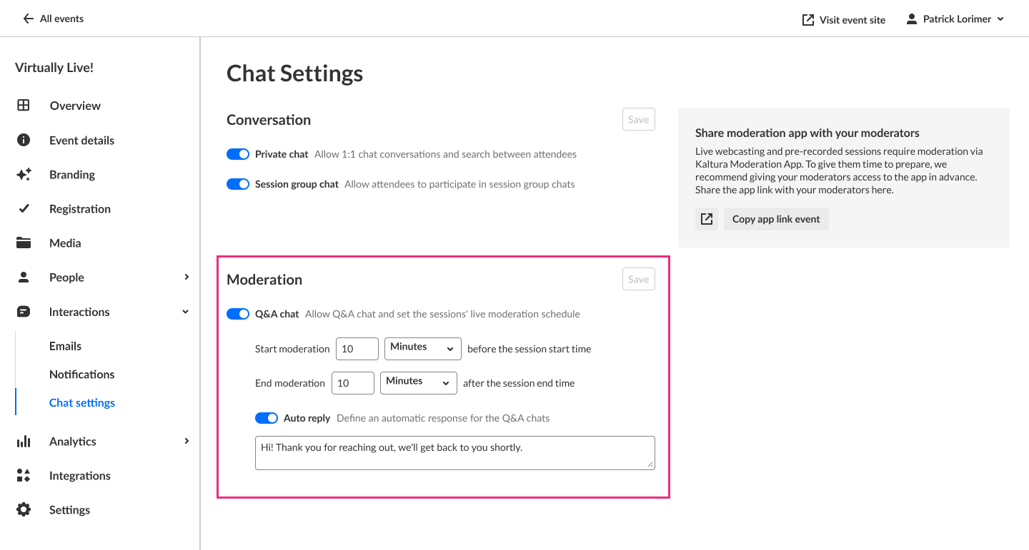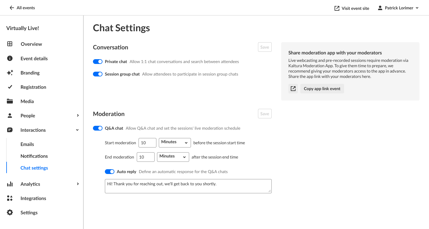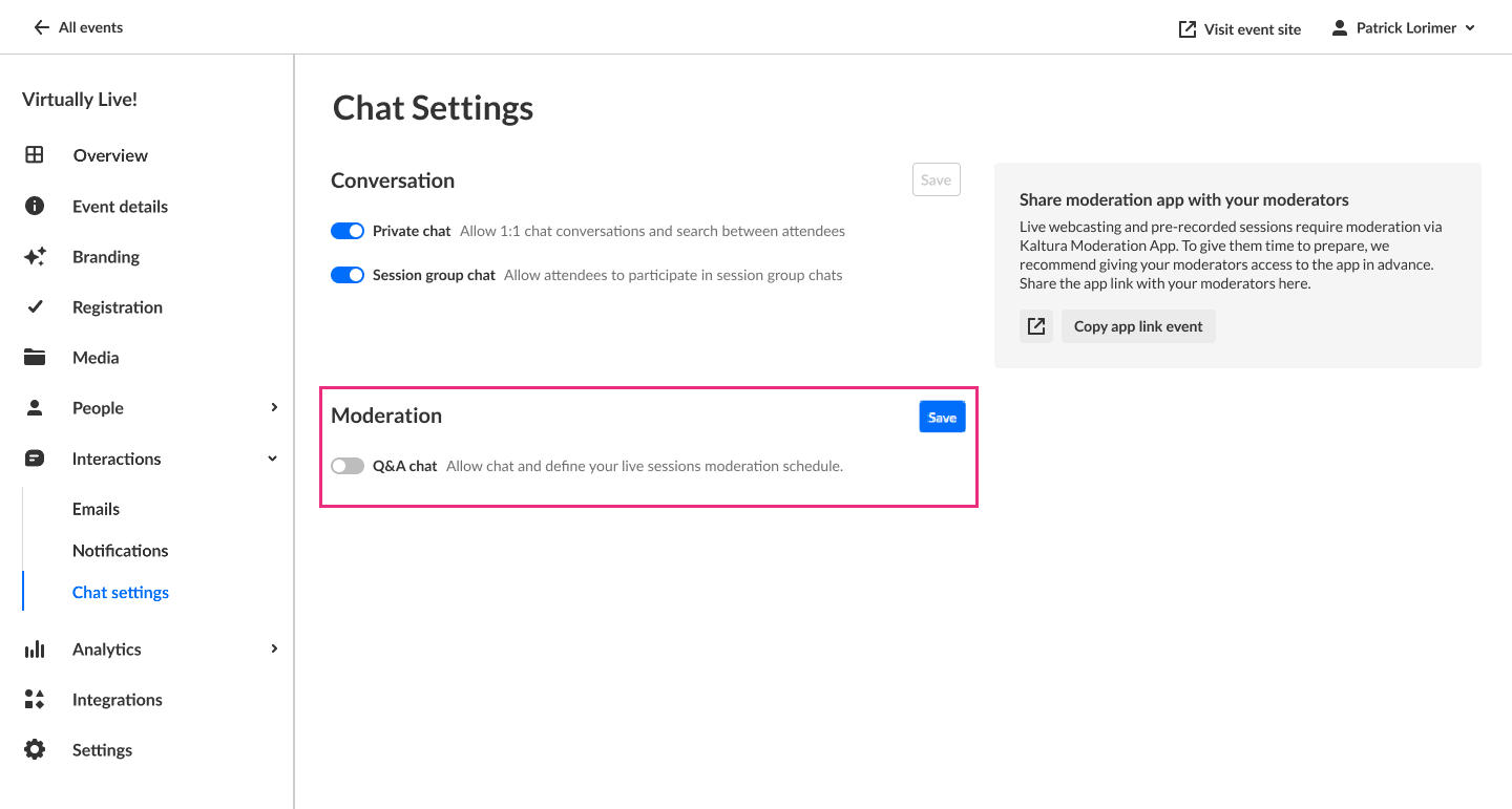 From the Chat settings page, you can also share a link with your moderators to manage and support attendees during the session through our moderation app. To share the moderation app with your moderators, click the Copy app link event button.