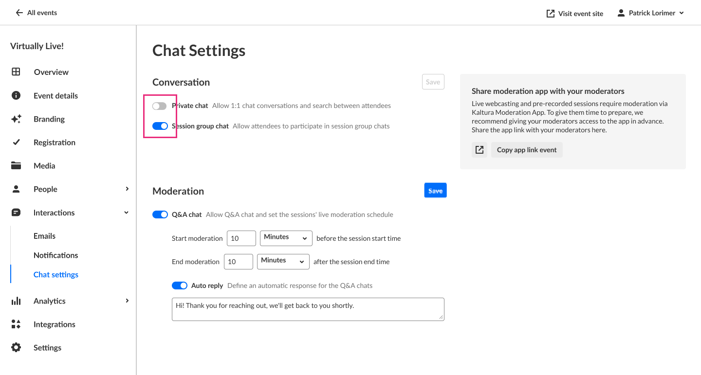 The Chat settings page allows you to enable and disable conversations for your event and enable and disable Q&A chat. If Q&A chat is enabled, the Chat settings page also allows you to define your live session's moderation schedule and set a chat welcome text.