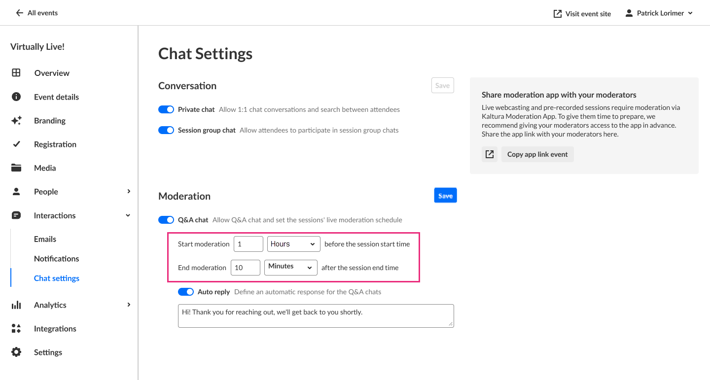 If you chose to enable Q&A chat, additional settings are available to define your sessions' live moderation schedule.