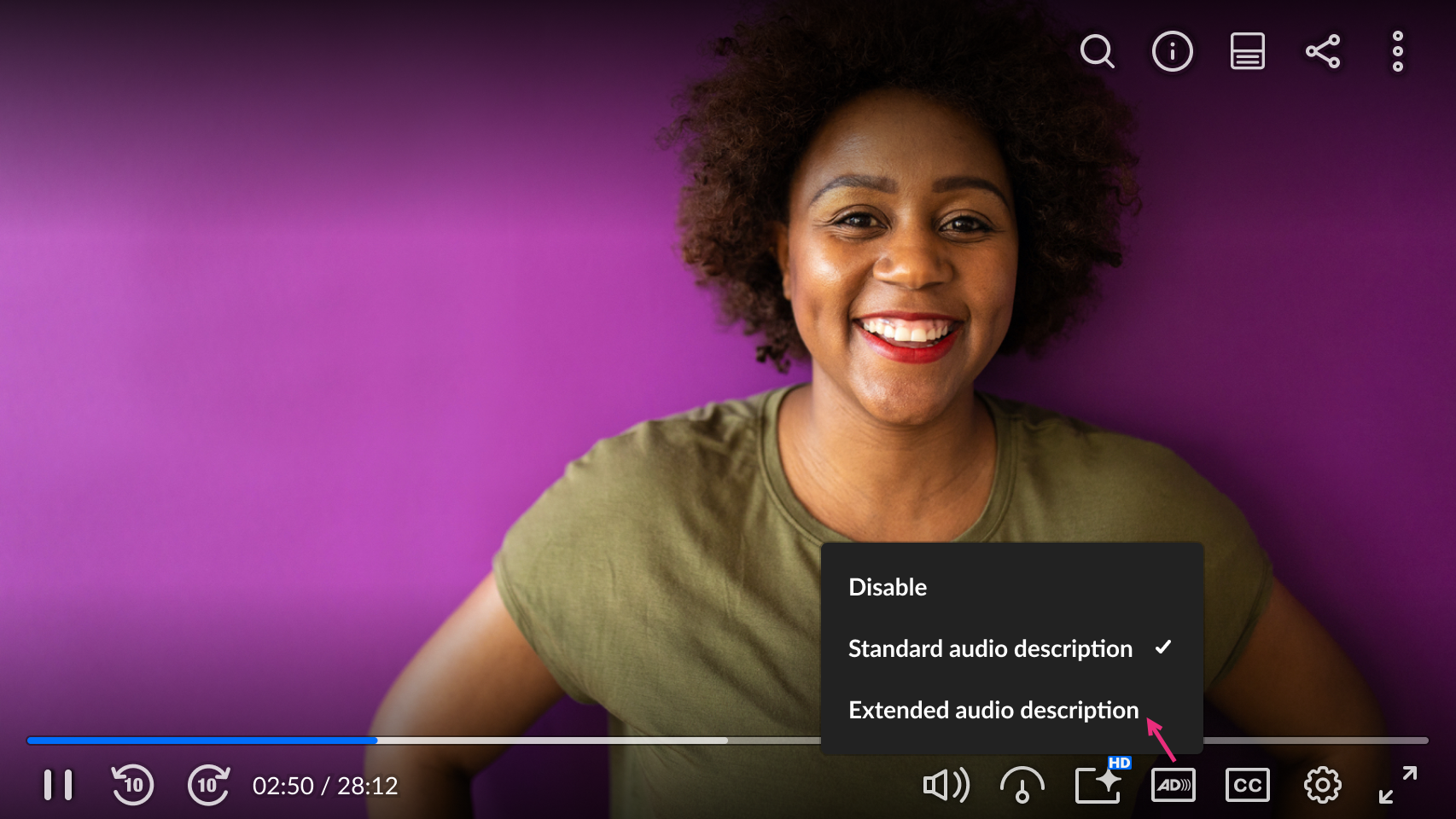 View options - Choose where the audio description controls appear - either inline in the player control bar or grouped under the settings menu.
