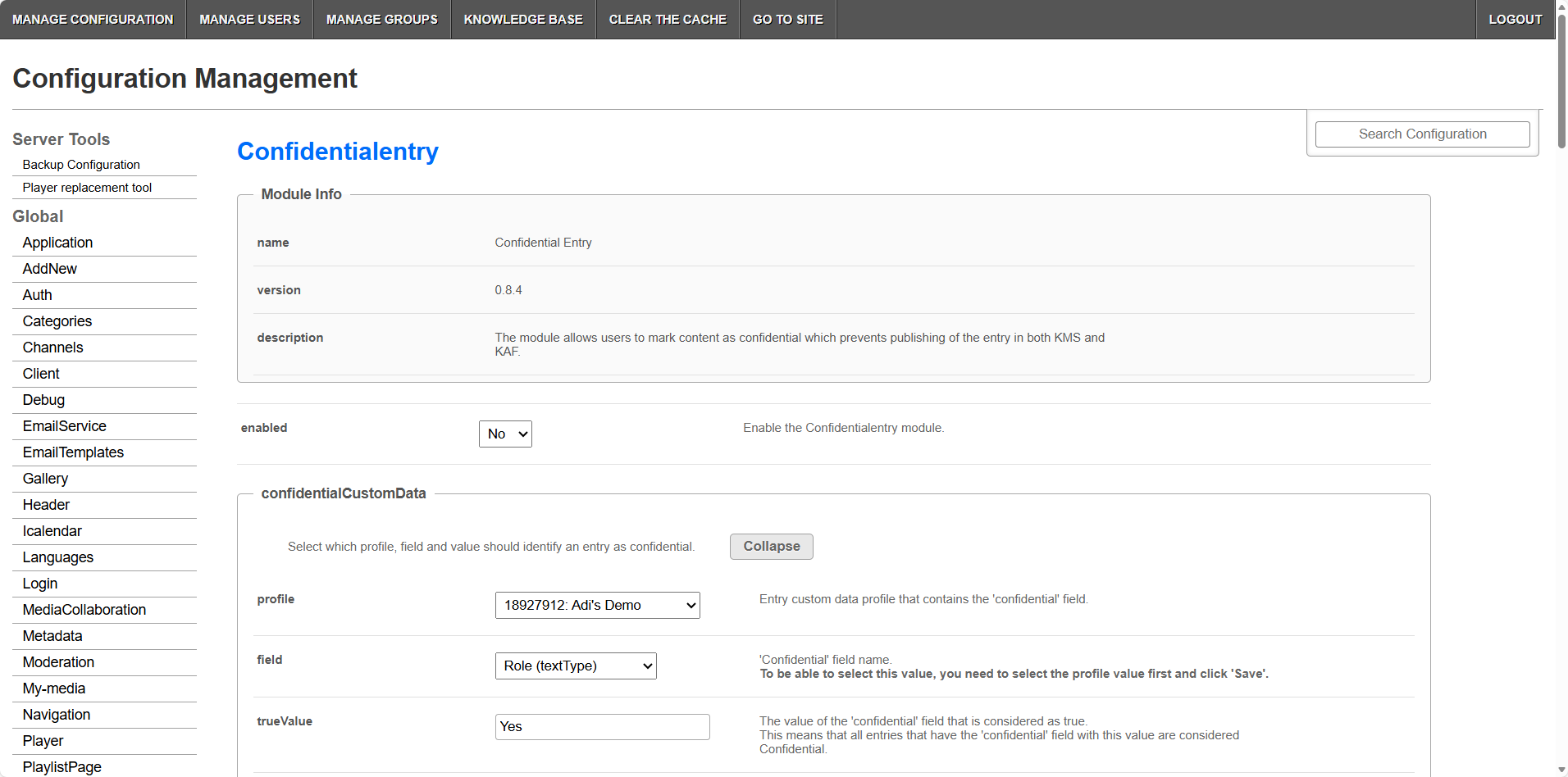 The Confidentalentry module allows users to mark content as confidential which prevents publishing of the entry in both KMS and KAF. This functionality is conditionally based on a custom metadata schema. Follow the steps to log into the Configuration Management section and configure the Confidentialentry module.