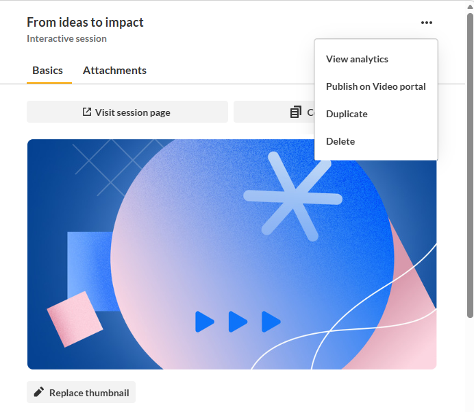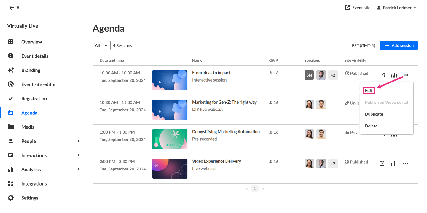 - On the Agenda page, click the three dots to the right of the session and choose Edit.