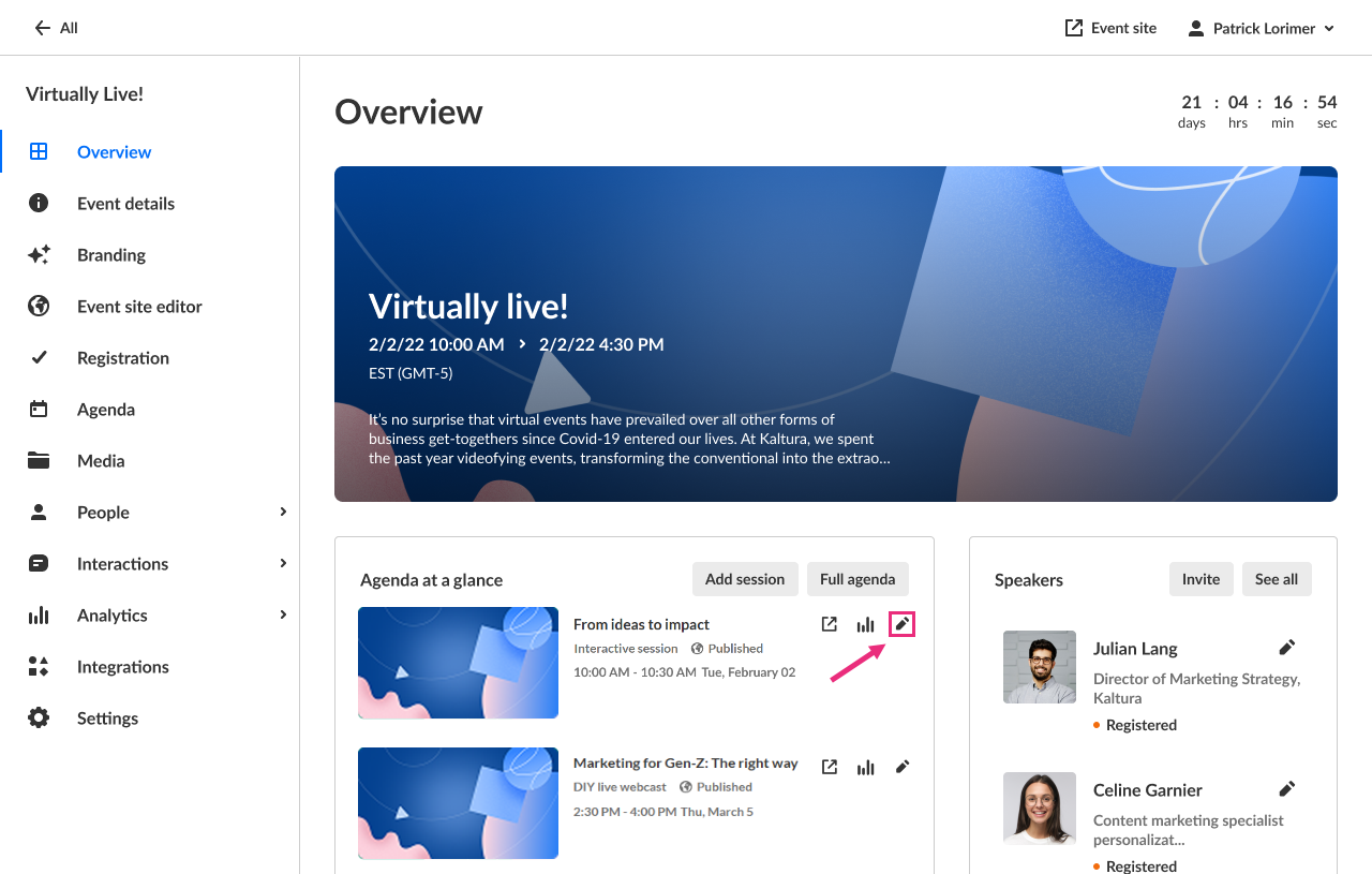 - On the Overview page, in the Agenda at a glance section, click the pencil icon next to the session.