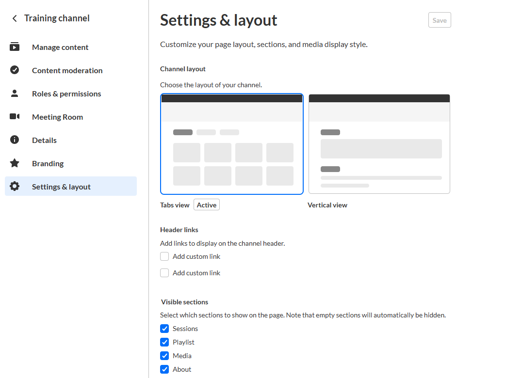 Use the Settings & layout tab to choose a channel layout and control which sections are visible to viewers.