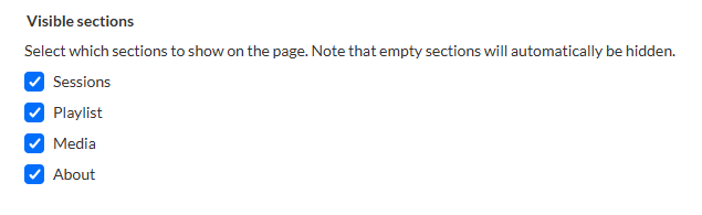 Use Visible sections to control which sections appear on the channel page. Select or clear the checkbox next to each section to show or hide it.