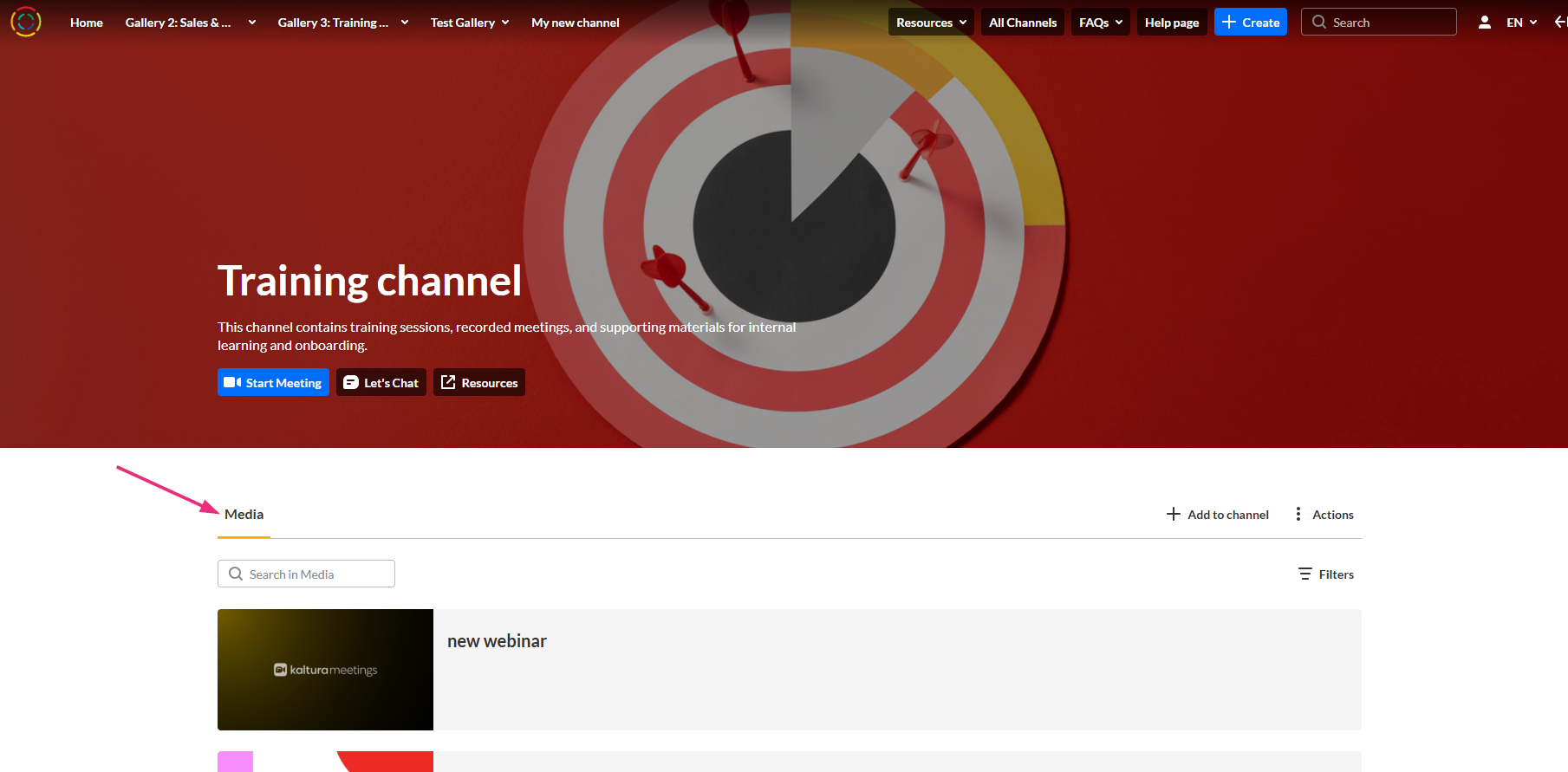 The image below shows the channel page with only the Media section visible, based on the selected section settings.