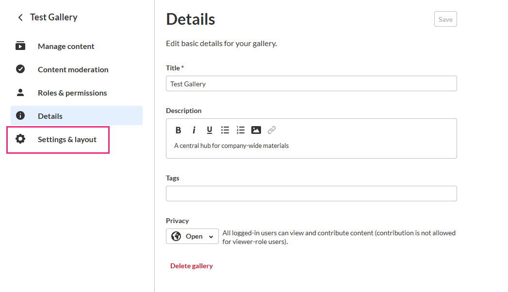 Configure your gallery using the steps below. Be sure to click Save at the top right when you finish.