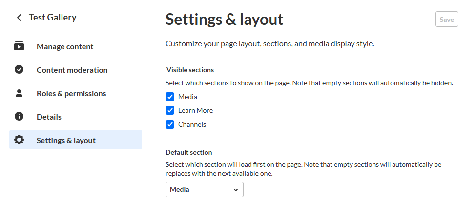 Select which sections appear on the gallery page. Available sections include: