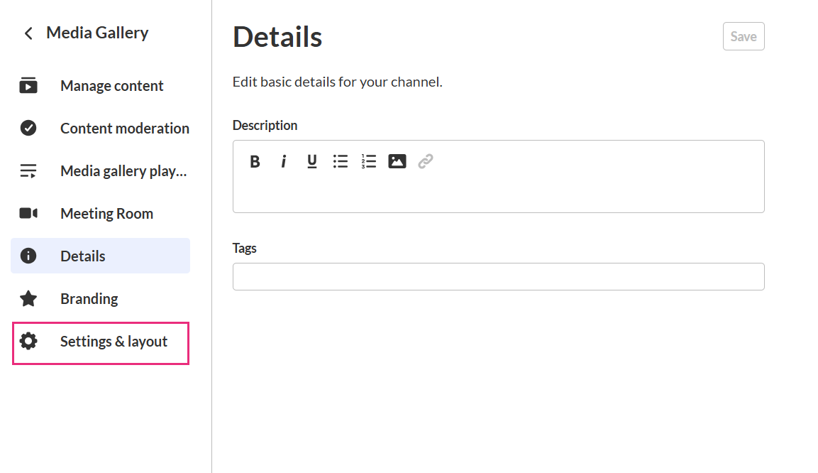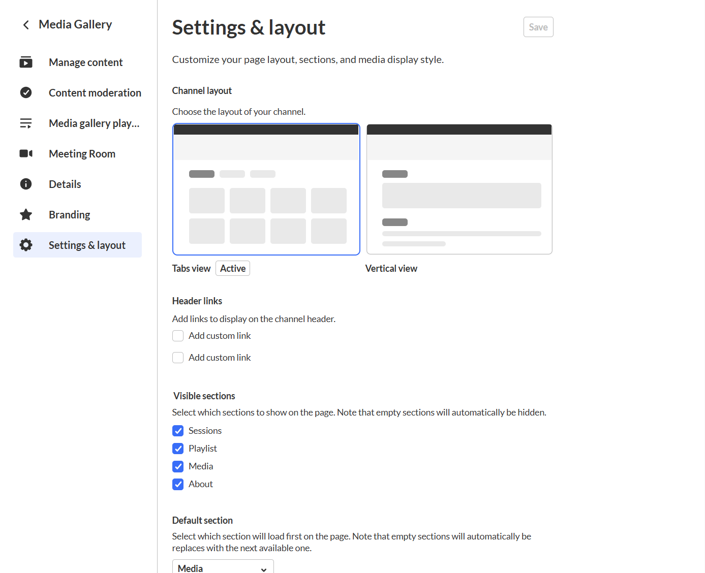 Use the Settings & layout tab to choose a layout for your media gallery and control which sections are visible to viewers.