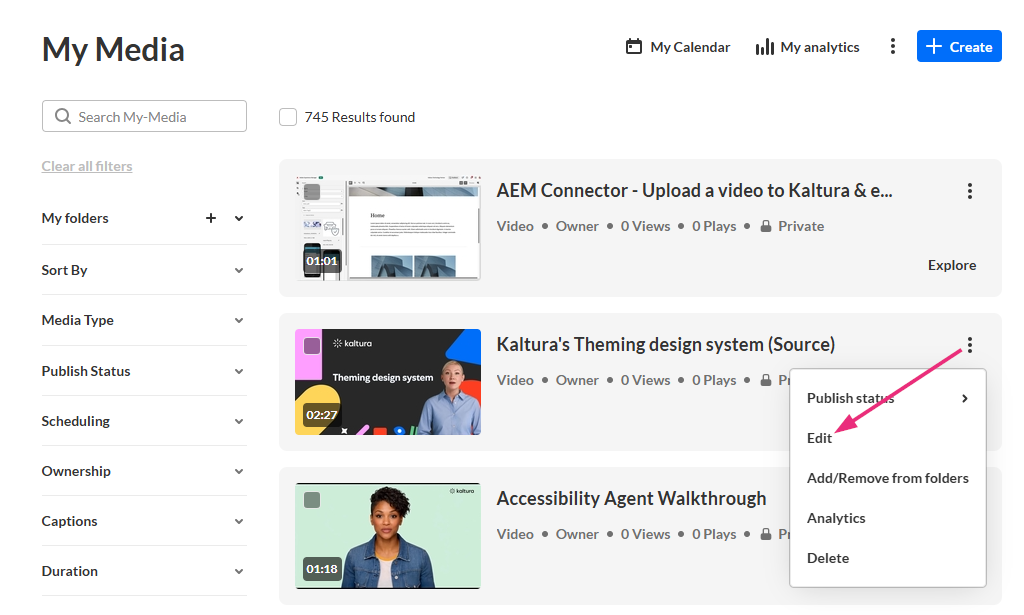 - On the 'My Media' page, click the three dots to the right of the desired media and select Edit.