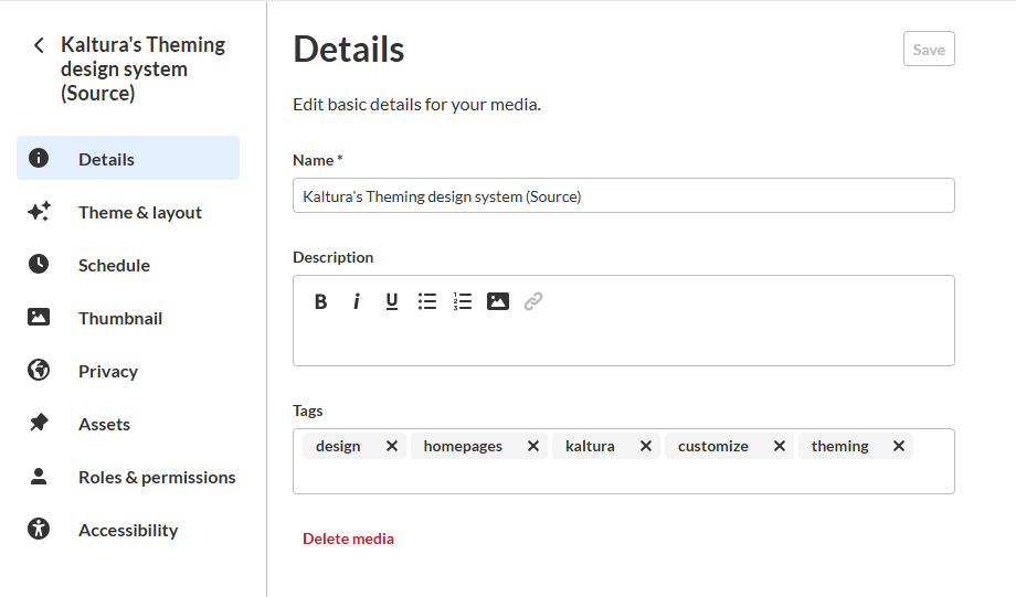 The edit media page opens on the Details tab by default, with a left-hand navigation.