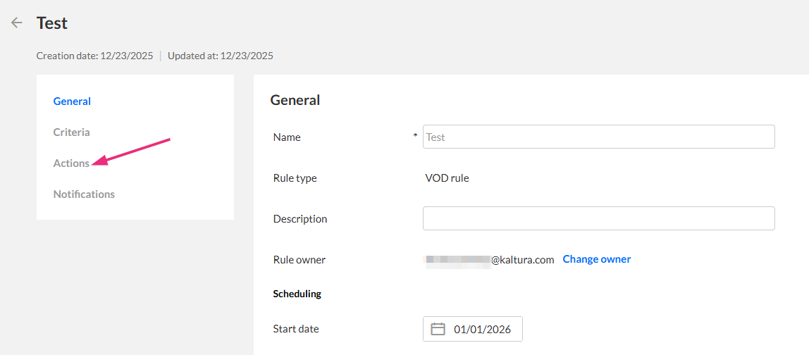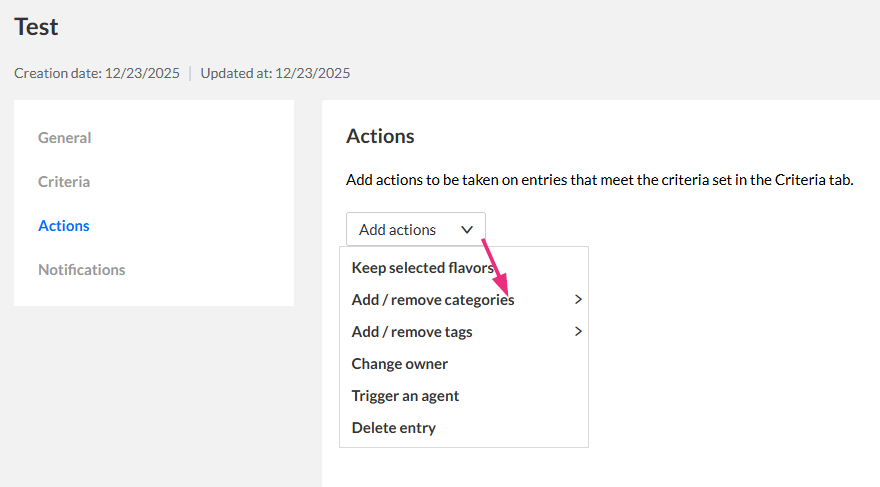 Rule actions define what Automation Manager does with media entries that meet a rule’s criteria. Actions are applied when a rule runs and can update metadata, manage categories and tags, change ownership, delete entries, or trigger agents.