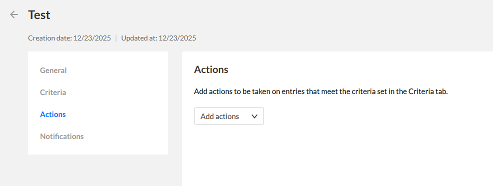1. On the Actions page, select the desired criterion from the Add actions drop-down menu (if the action includes sub-options, select the required option).