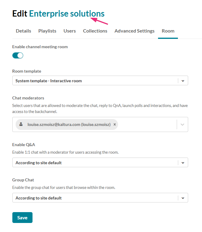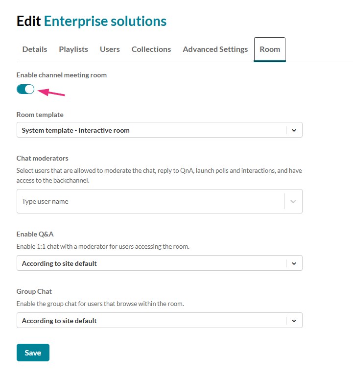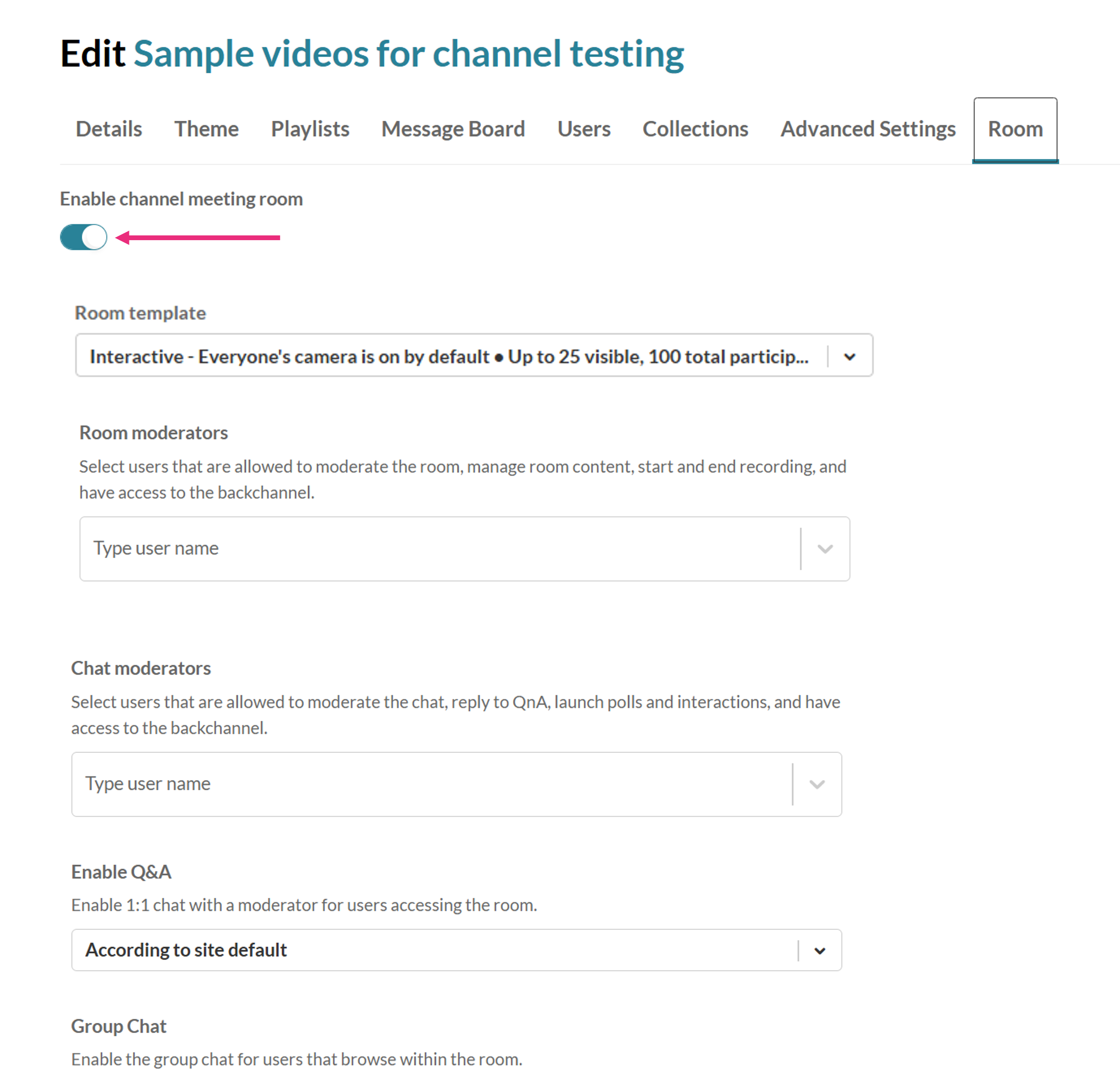 1. Under Enable channel meeting room, click the toggle to enable the room.