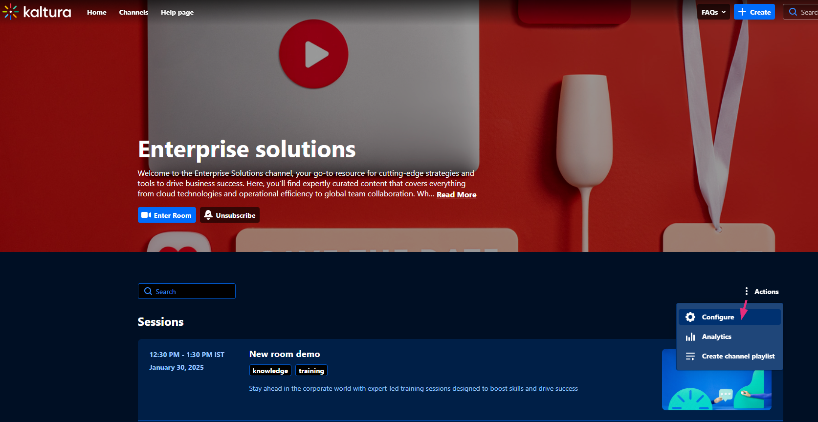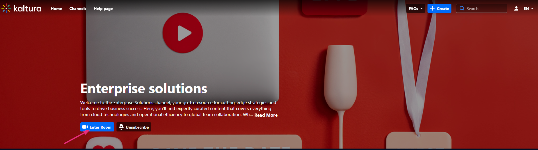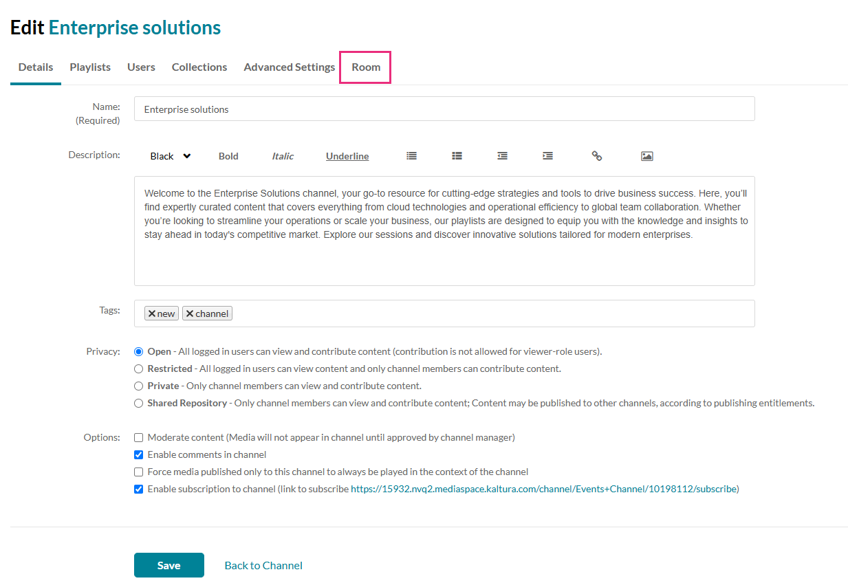 A Kaltura Room can be tied directly to a channel, creating a persistent virtual meeting space that anyone with access to the channel can join.