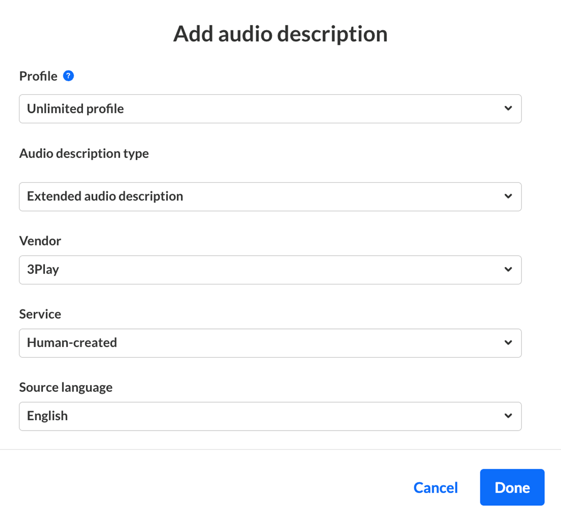• Vendor – Choose the provider offering the audio description service. If only one is available, this field won’t display.