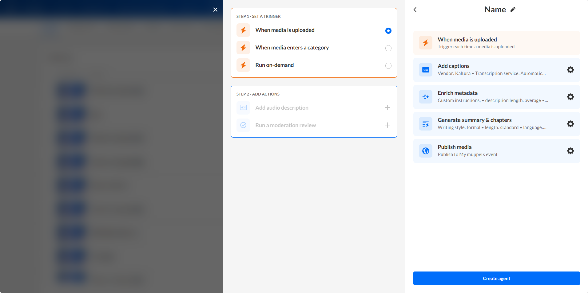 After you’ve set a trigger, added actions, and named your agent, you’re ready to create it.