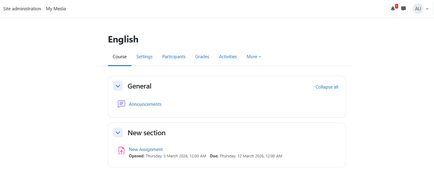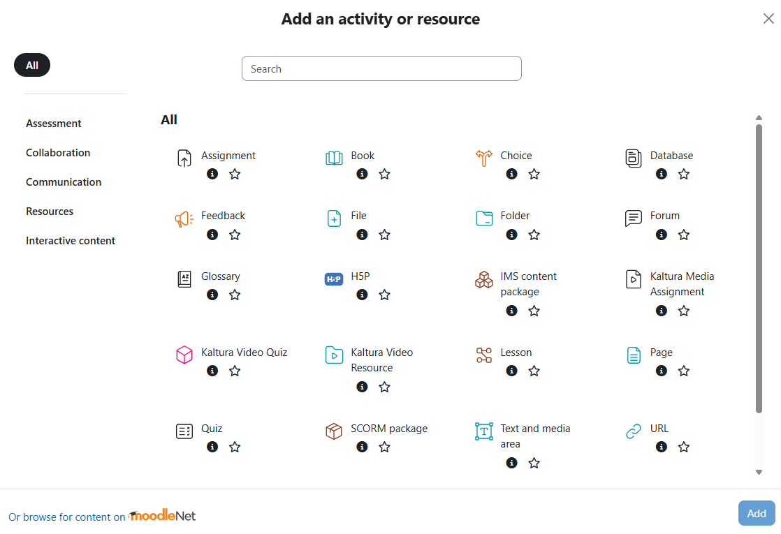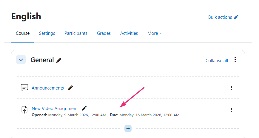 - This workflow uses Moodle’s built-in assignment activity. If your course uses the legacy Kaltura Media Assignment activity, please see Create a Kaltura Media Assignment instead.