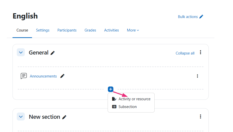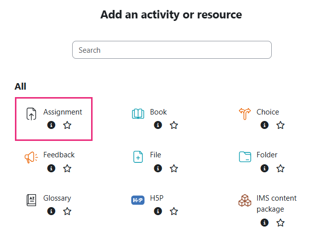 - Locate the section where you want to add the assignment, click the + icon and select +Add an activity or resource.
