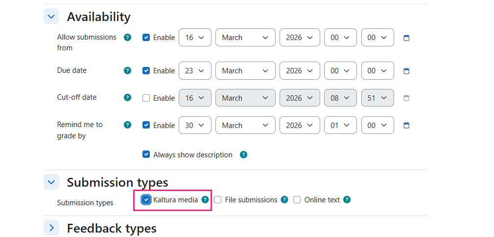 - Scroll down to the Submission types section and select the box next to Kaltura media.