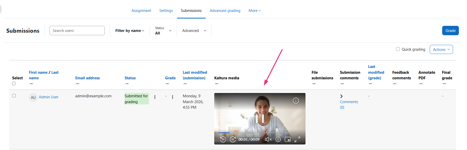 The Submissions page displays a table listing all student submissions. If a student submitted a Kaltura video, it appears in the Kaltura media column.