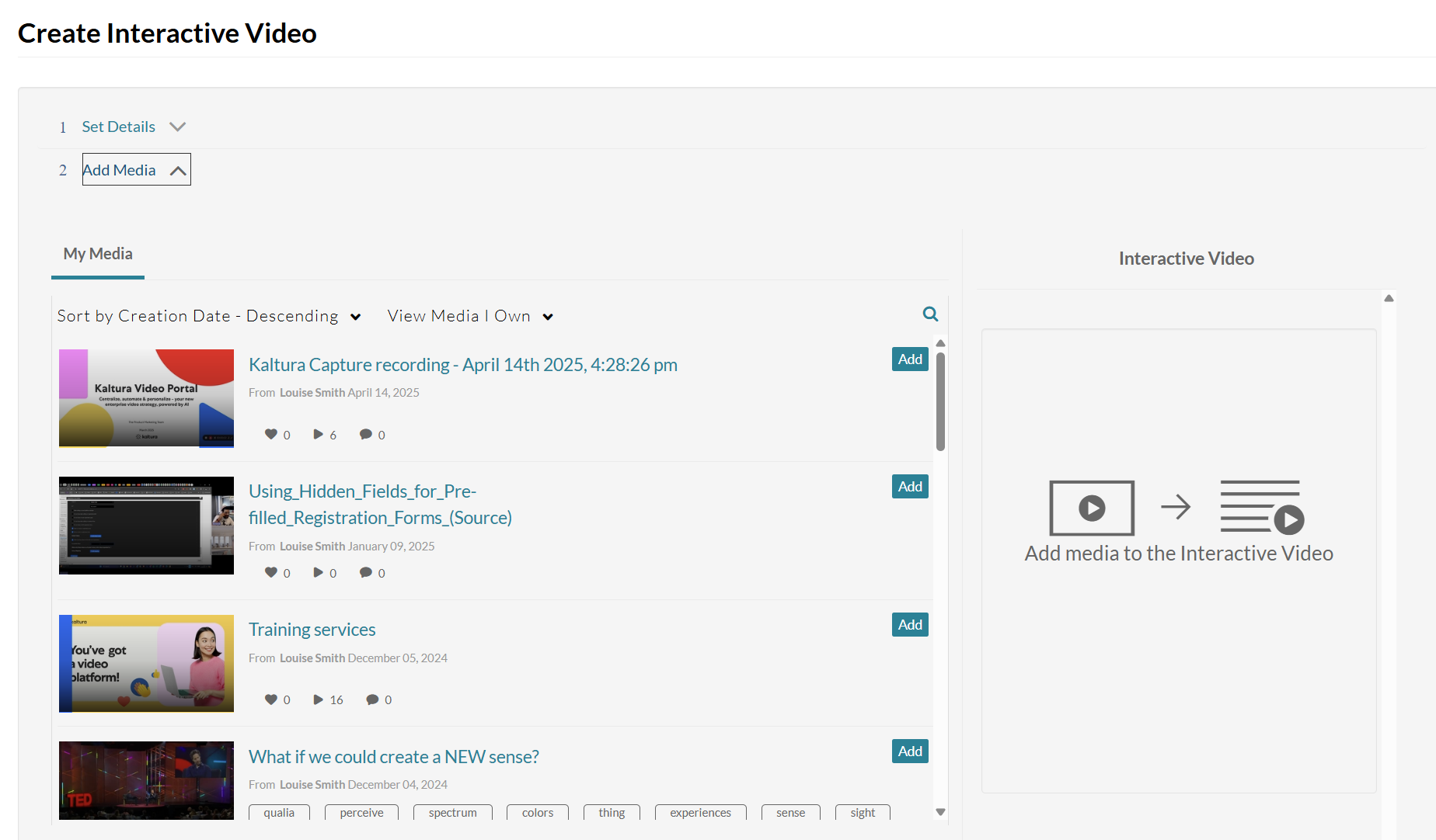 After you close the composer, you can find your video in My Media. You can use the search bar or filter by media type to display only Interactive Videos. Click the thumbnail or title to open it, and the interactive experience will start playing automatically.