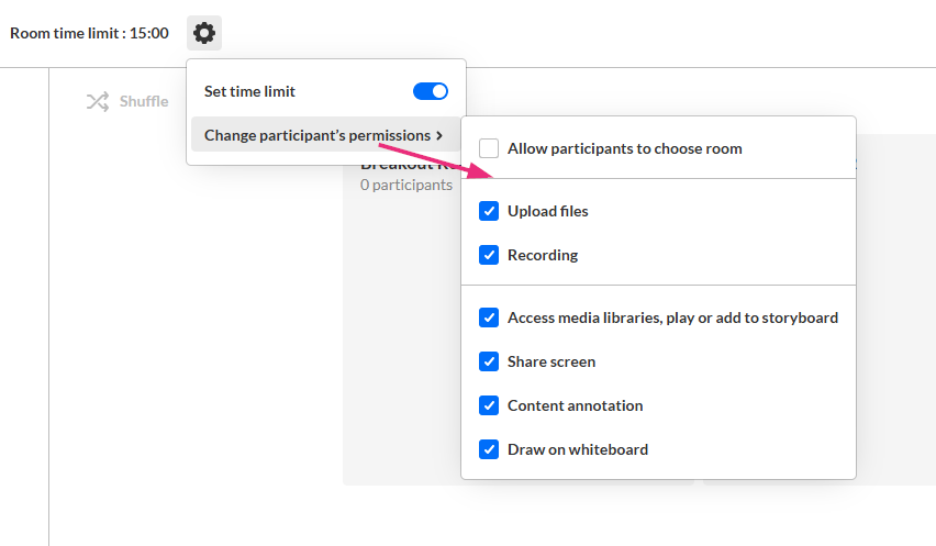 Click the settings (gear) icon and select Change participants permissions to define what participants can do in breakout rooms.