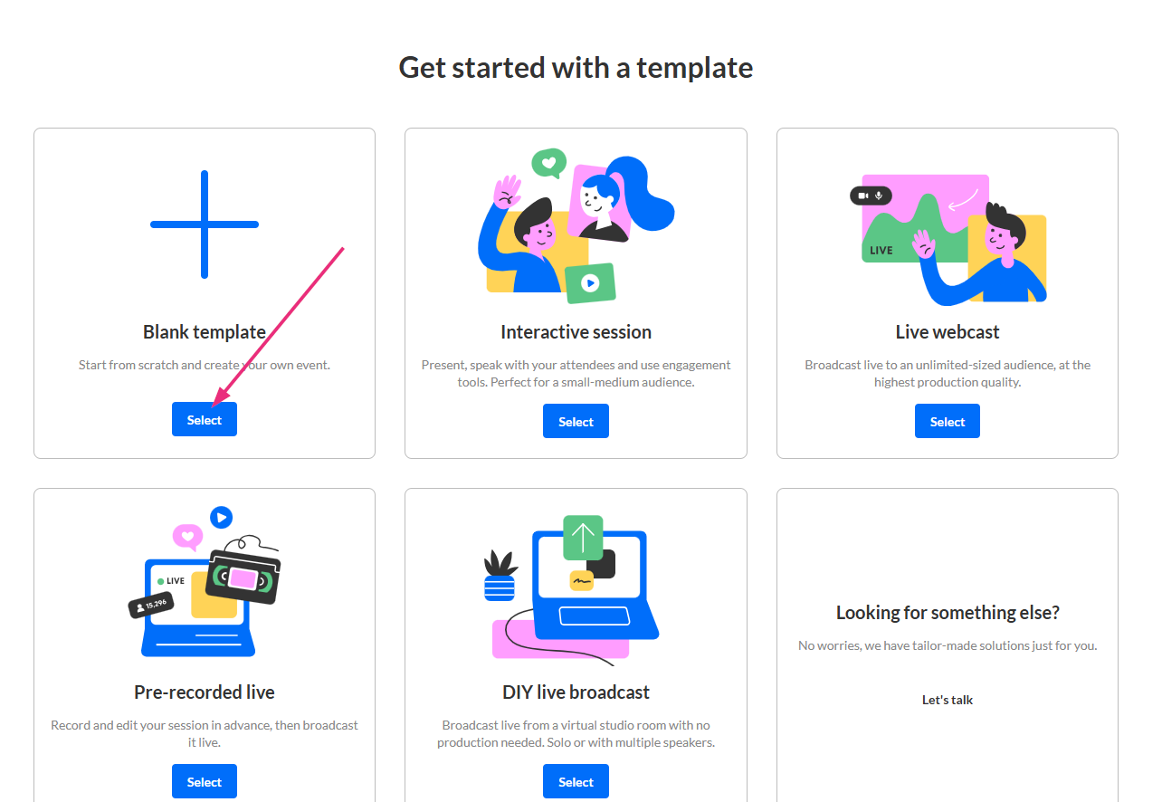 The Blank template lets you start from scratch and build a custom event. This option isn’t tied to a specific session type.