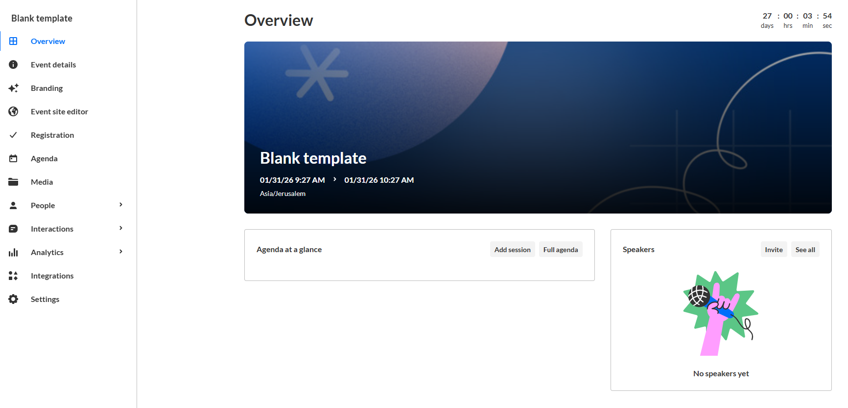 Once the event is created, it appears on the Overview page, which opens by default. At this stage, the event site and registration aren’t published yet.