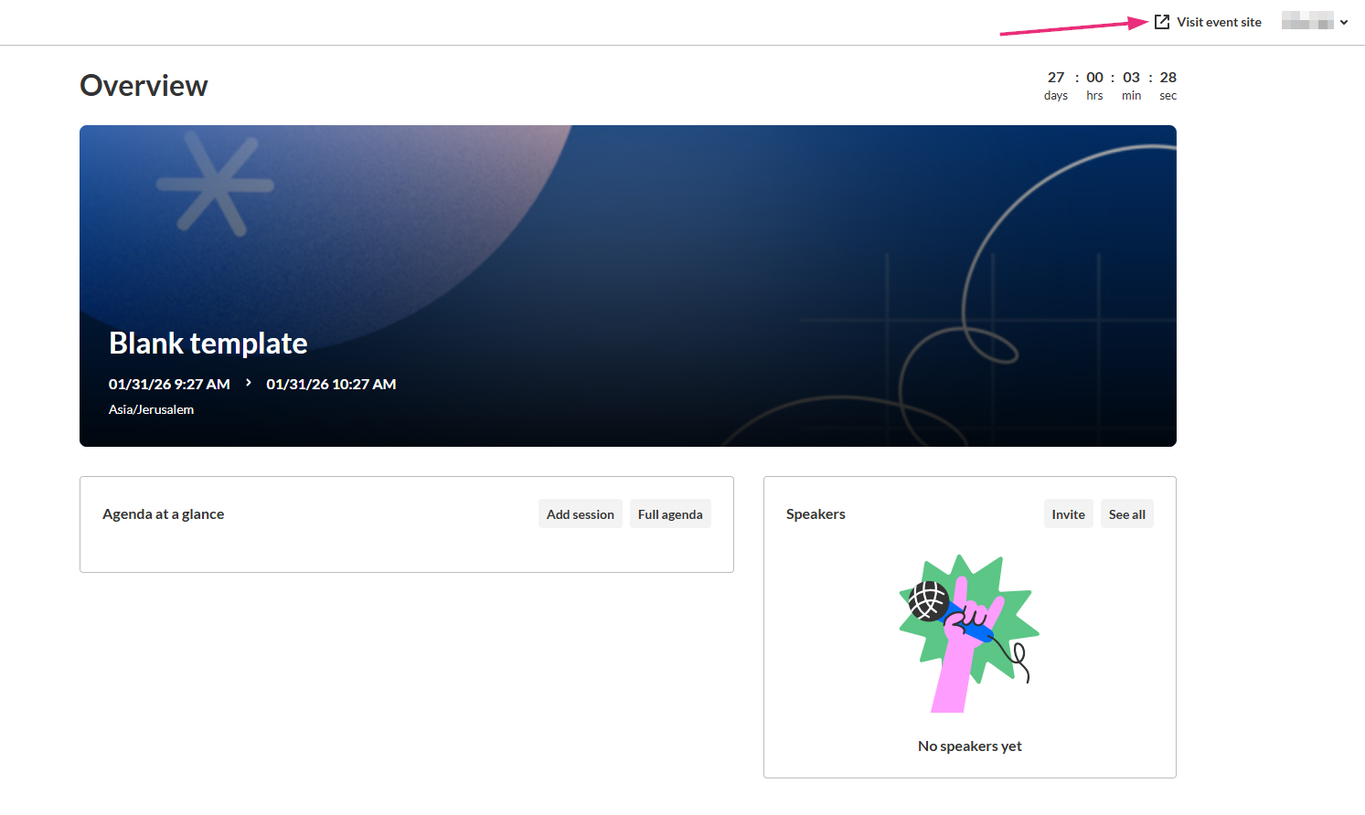 The Overview page also includes a link to the event site. Click Visit Event site at the top right corner to preview it.