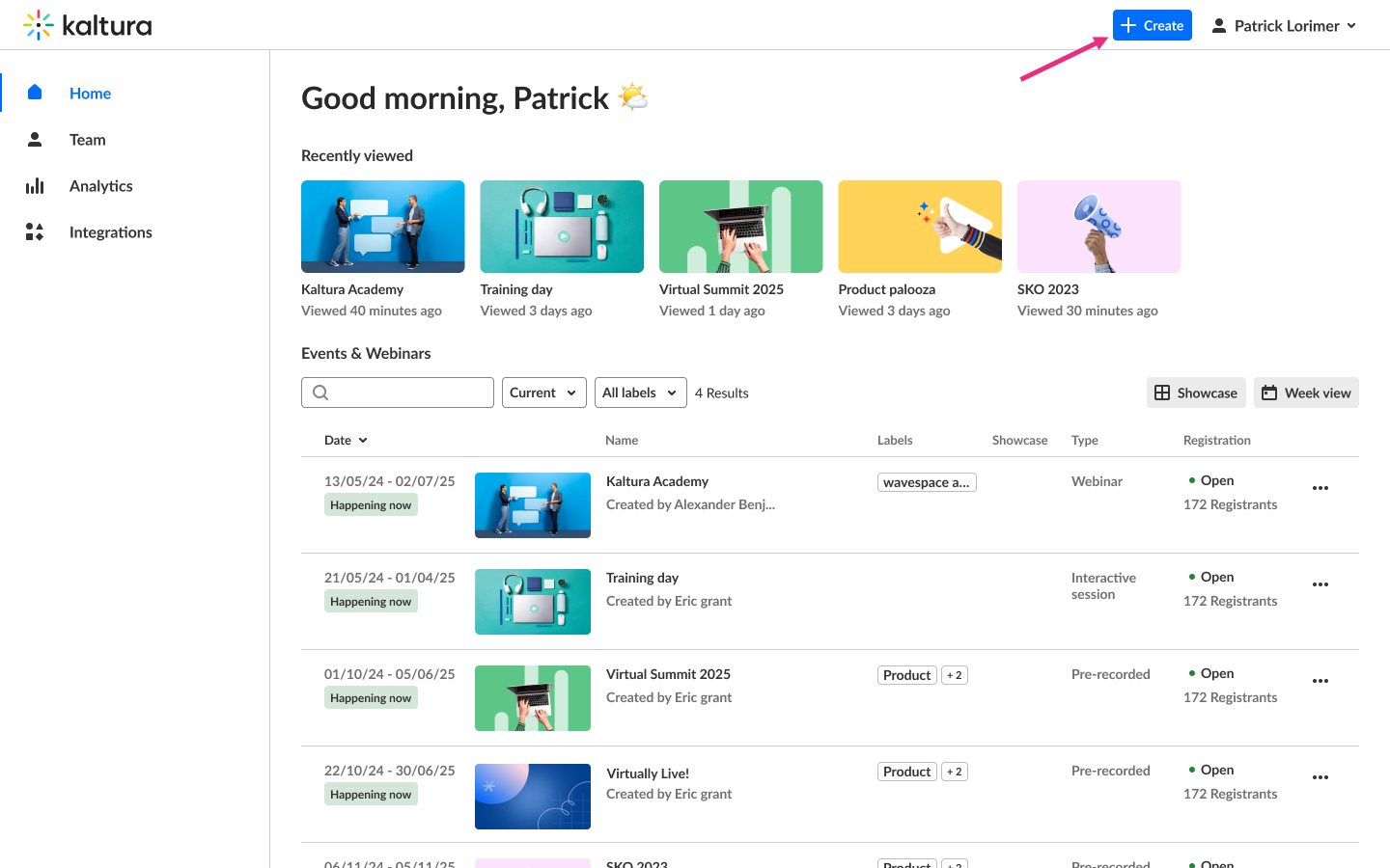 - Log into your Kaltura Events account. The homepage displays.
