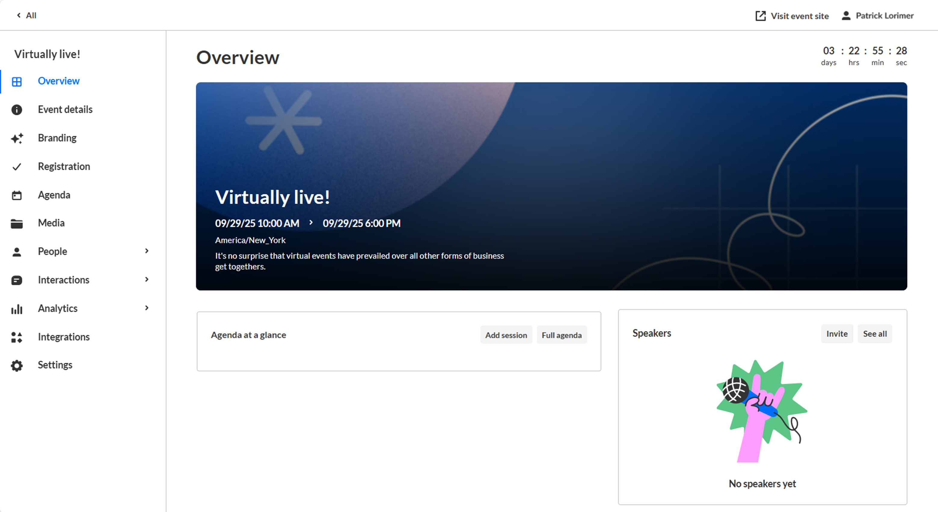 - Agenda at a glance -A list of event sessions with access to each session’s page, analytics, and editing options