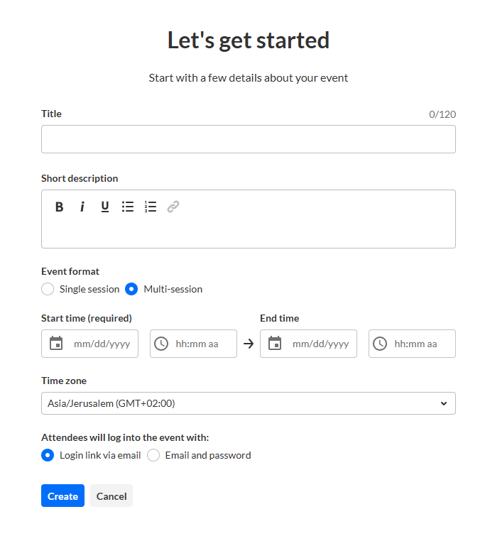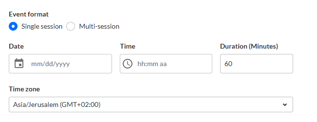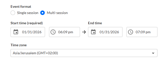 - Event format - Choose single session or multi-session. For information on these formats, see Single-session vs multi-session events.