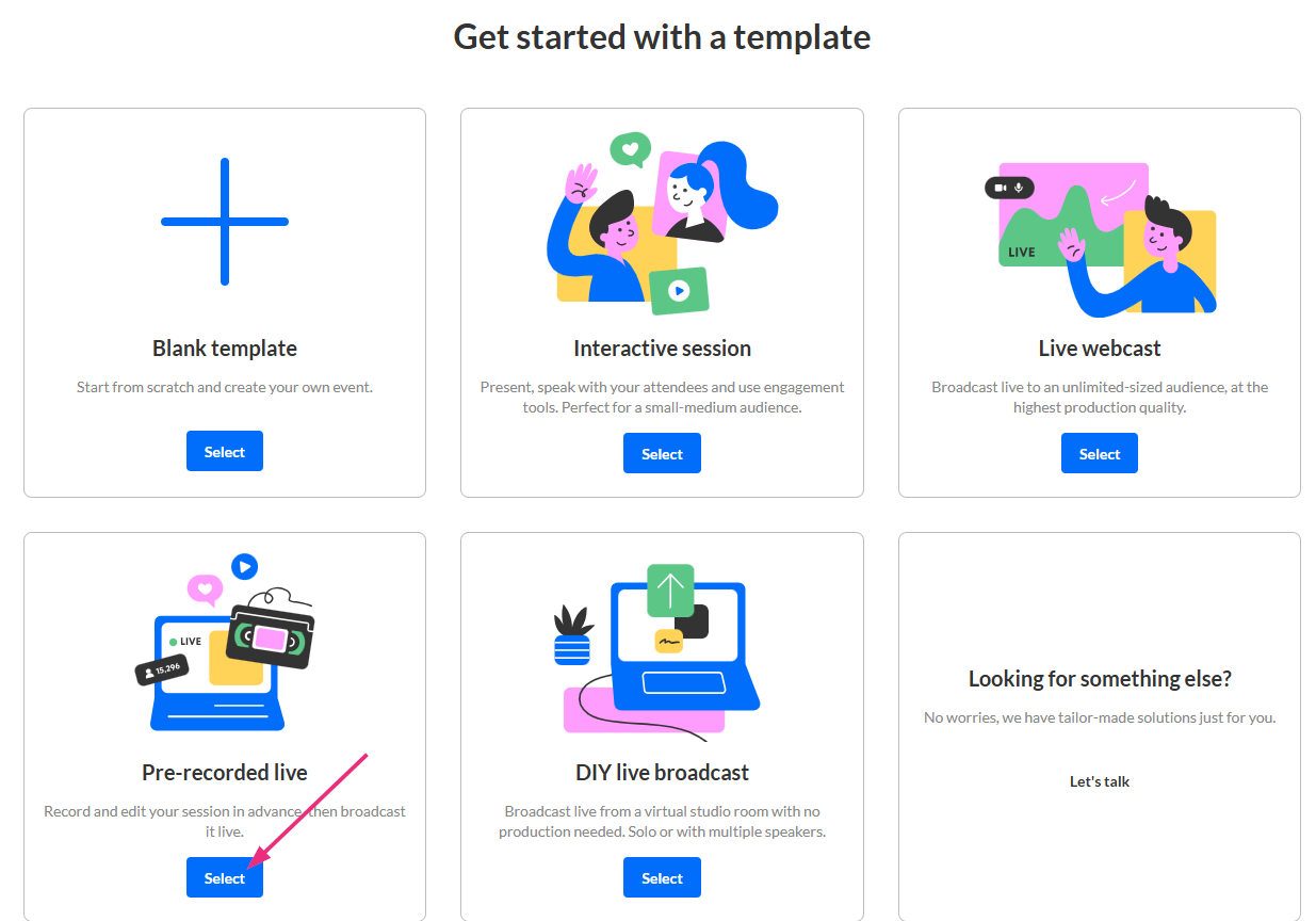 If your Kaltura Events account includes Custom templates, the Get started with a template page shows two tabs: Presets and Custom. If Custom templates aren’t configured, only Preset templates appear.
