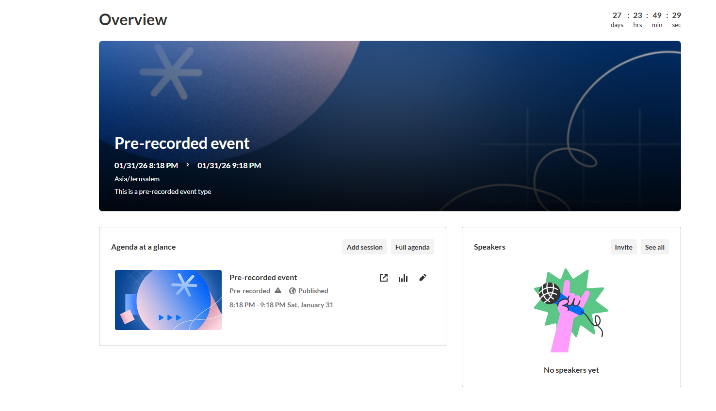 - Agenda at a glance -A list of event sessions with access to each session’s page, analytics, and editing options