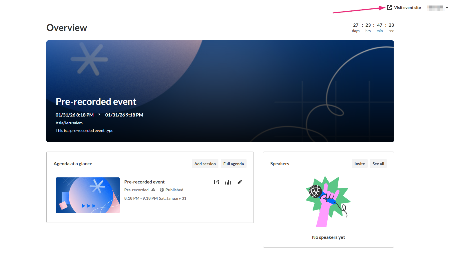 The Overview page also includes a link to the event site. Click Visit Event site at the top right corner to preview it.