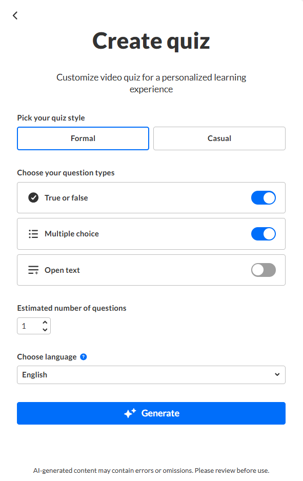 Automate the creation of engaging, customizable quizzes that appear throughout the video content. Quiz drafts can be saved and edited.