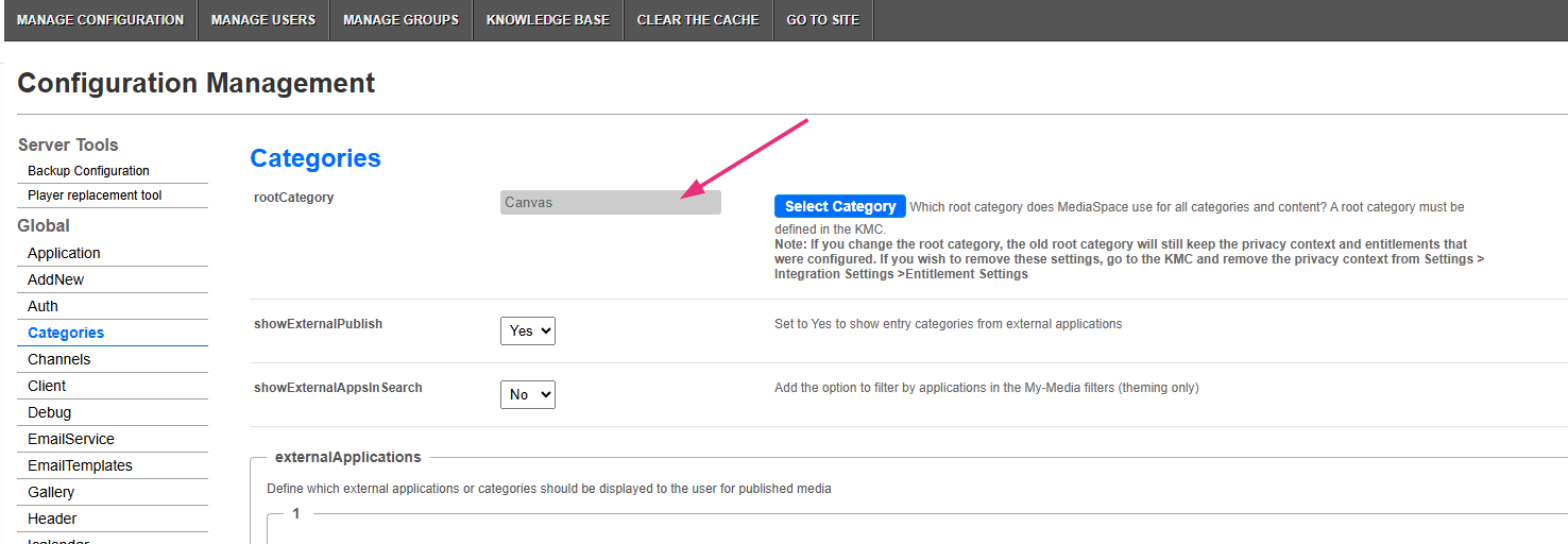 After installing the Kaltura Video integration in your LMS, you will need to specify the root category you created. See the Categories module for details.
