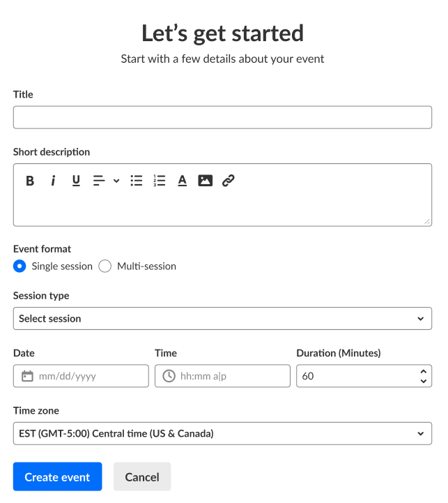 Event format - Choose single session or multi-session. For information on these formats, see Single-session vs multi-session events.