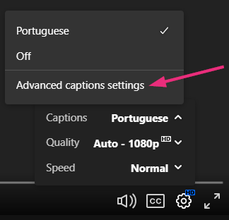 - Click the arrow next to the captions label to open the advanced captions settings option.