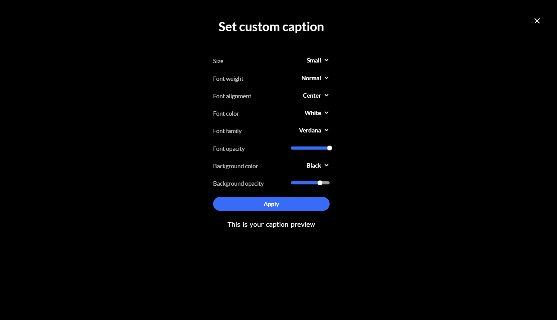 3. Click Apply to save your settings and return to the 'Advanced captions settings' screen.