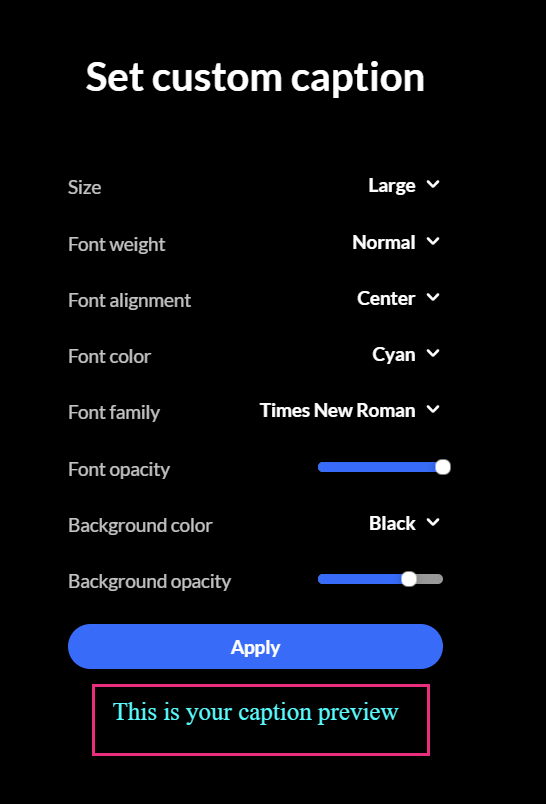 - Font opacity: control how transparent the caption text appears (100% = solid, lower values make the text more see-through)