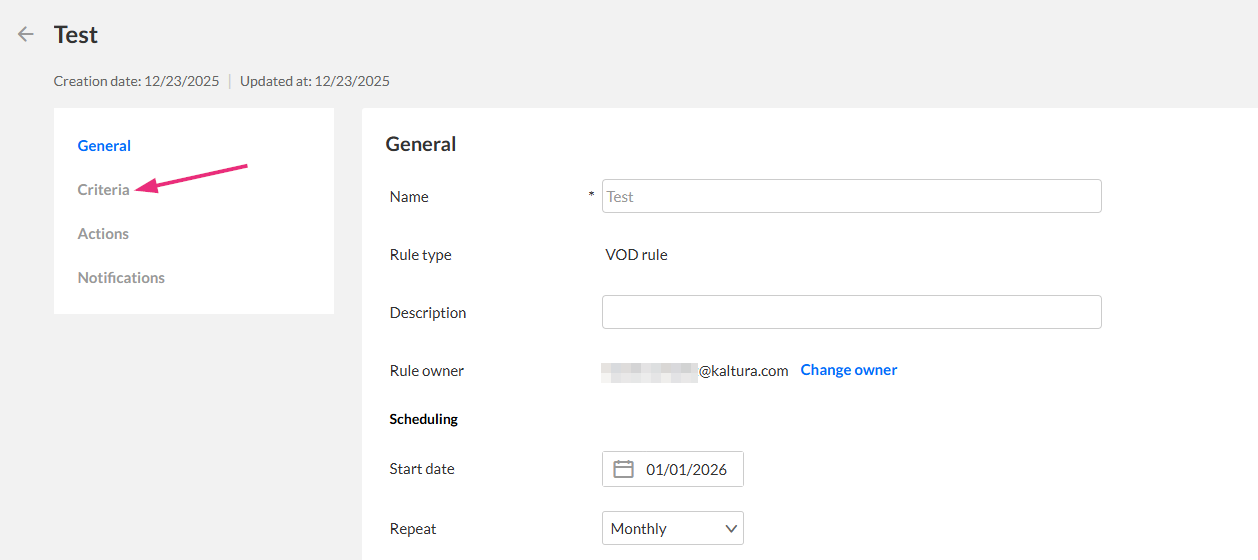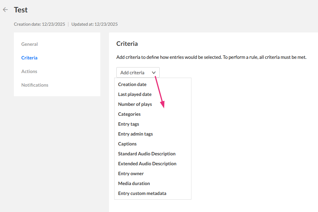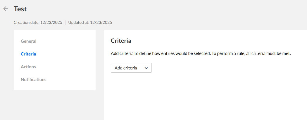 Rule criteria determine which media entries Automation Manager selects when a rule runs. Criteria are used to filter entries based on metadata, usage, ownership, accessibility, and other attributes.