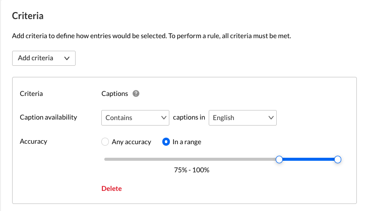 This example selects media that contains English captions and has caption accuracy within a specified range.