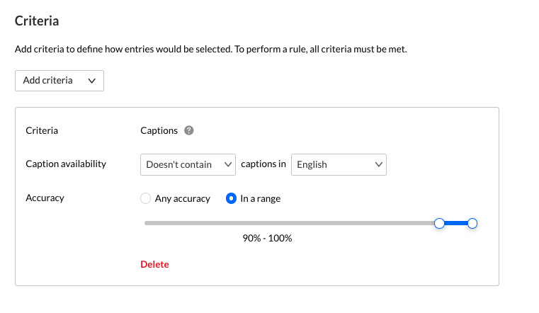 Use this setup to identify media that does not meet your captioning requirements. This can include entries that are missing captions in a required language or have captions that fall below an acceptable accuracy threshold.