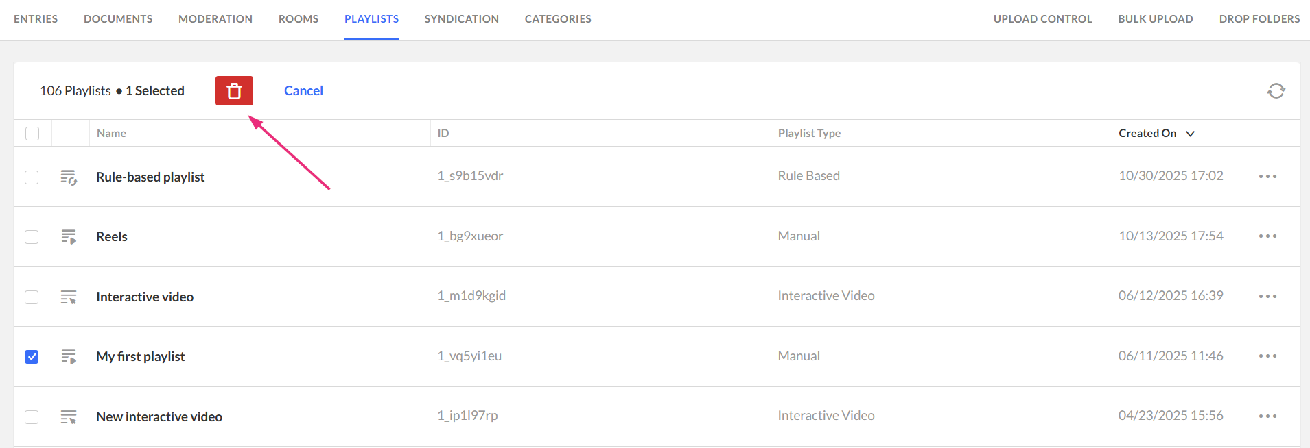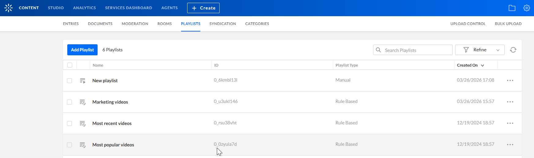 You can delete one or more playlists in the KMC if they’re no longer needed. Deleting a playlist permanently removes it from your account, but does not delete any of the media entries it contains.