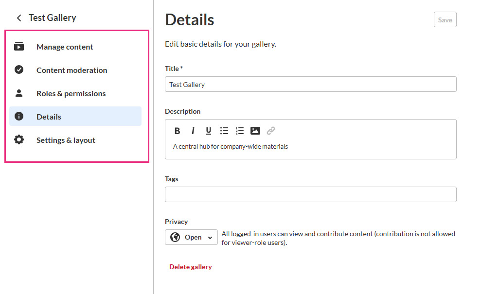 Update the gallery title and description, set privacy, and manage other core gallery options.