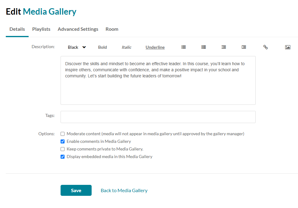 • Description - Enter a summary of the content to display on the Media Gallery page.