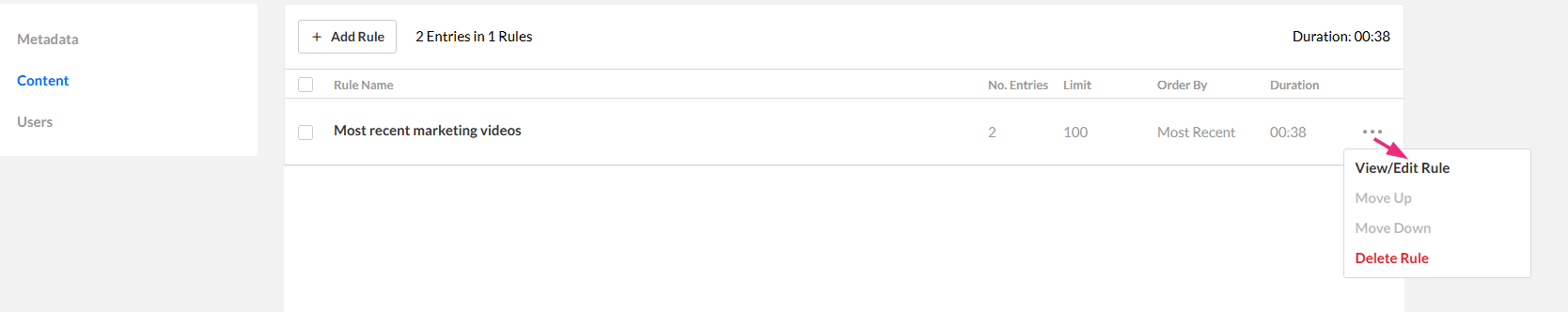 - On the 'Content' page, click the three dots to the far right of the rule and select View/Edit rule.